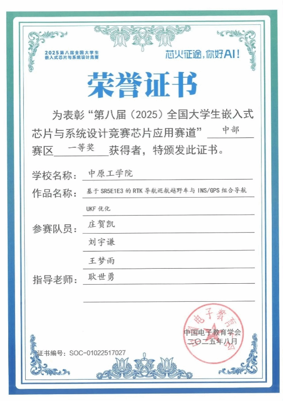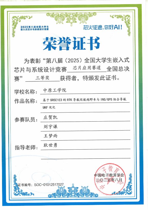 耿世勇老师指导,庄贺凯、刘宇谦、王梦雨团队提交的作品“基于SR5E1E3的RTK导航巡航越野车与INS/GPS组合导航UKF优化”荣获应用赛道总决赛三等奖。