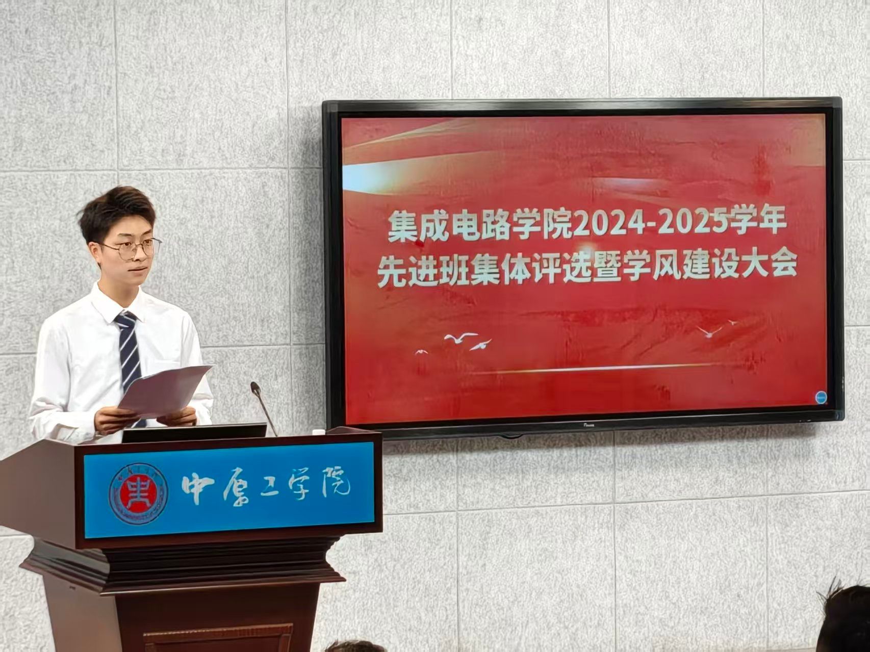 大会伊始,主持人详细解读先进班集体评选办法,重点说明评分标准与“一票否决”相关细则,为后续评选工作划定清晰准则。