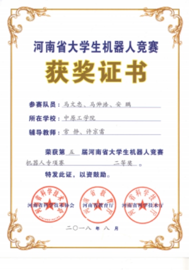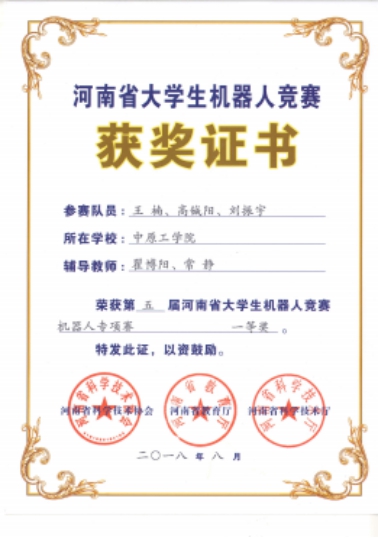 2018年度全国机器人大赛河南省一等奖1项、二等奖1项。